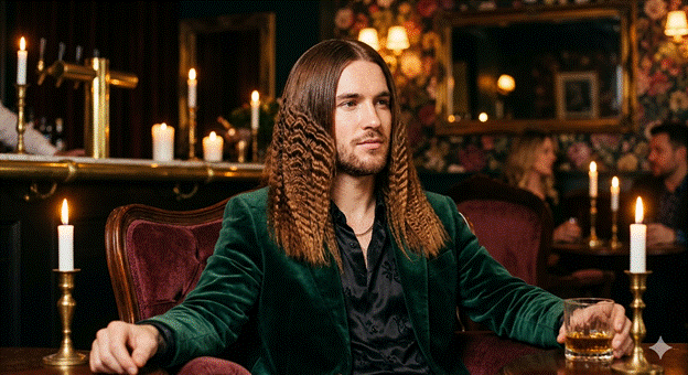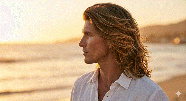 The feathered hairstyle — those long, swept-back layers parted dramatically at the center or side — is one of the era’s most romantically beautiful expressions of masculinity. Inspired by the golden-hued California surfer aesthetic, feathered layers communicated sun, freedom, and effortless confidence.