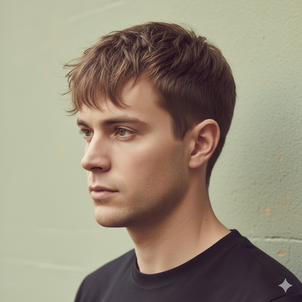 The textured approach gives movement to otherwise still, short hair. It suits men with fine to medium hair density, and the fringe adds an artistic quality that elevates even the most casual outfit.
