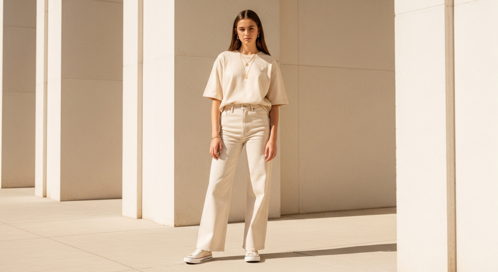 Styling Tip: Choose a tone that works naturally with your skin tone and existing wardrobe pieces. Cream and warm ivory suit warm skin tones most beautifully; cool grey and white suit cooler skin tones; warm camel and brown complement warm and olive skin tones with remarkable elegance. Build the monochrome casual look in slightly varying tones within the same colour family — an ivory tee, cream wide-leg jeans, and an oatmeal knit layer create far more visual interest than three pieces of identical white. Add a single accessory in the same tone or a complementary metallic — gold for warm palettes, silver for cooler ones.
