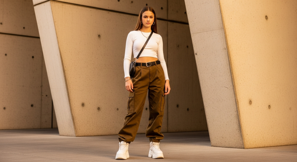 Styling Tip: Choose cargo trousers in a relaxed but not overwhelmingly baggy fit — the waist should sit comfortably at or slightly below the natural waist. Earthy tones — warm olive, khaki, warm grey, and faded black — are the most versatile and most stylish cargo pant colours for teen casual wear. Pair with a fitted ribbed crop top, a simple baby tee, or a clean fitted long-sleeve in a complementary neutral. Add chunky platform trainers or clean lug-sole boots and a small crossbody or belt bag. The proportional contrast between the volume of the cargos and the clean fit of the top is the entire visual logic of this look.