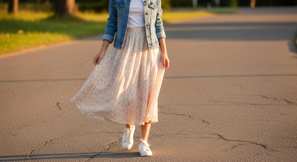 A classic denim jacket worn over a simple top with a flowing midi skirt is one of the most flattering and most genuinely elegant casual outfit ideas for teens — a combination that balances the casual confidence of denim with the soft femininity of a longer skirt in a way that feels both current and timeless.