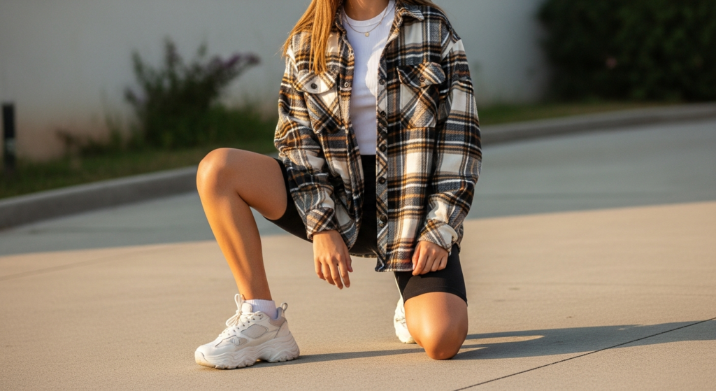 An oversized flannel shirt worn open as a layer over a fitted top with bike shorts is the casual teen outfit that carries the most relaxed, most authentically personal cool of any look on this list. It references nineties grunge and collegiate casual simultaneously, and its comfort-first philosophy does nothing to diminish its genuine style credentials.