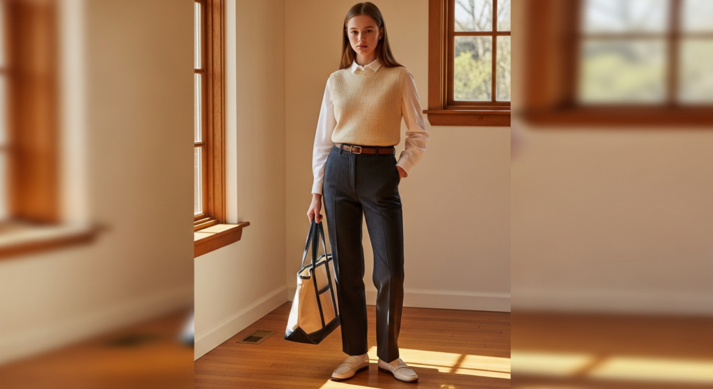 Styling Tip: Choose a knit vest in a warm neutral — cream, warm oatmeal, camel, or soft sage — and wear over a white or ecru fitted collared shirt or a simple ribbed long-sleeve with the collar or neckline visible above the vest. Tuck into high-waist straight-leg trousers in charcoal, navy, or warm cream, or into well-fitted straight-leg jeans for a slightly more casual interpretation. Add leather loafers or clean canvas trainers, a tote bag large enough for school essentials, and simple stud earrings. This is the casual teen outfit that photographs most beautifully in warm natural indoor light.