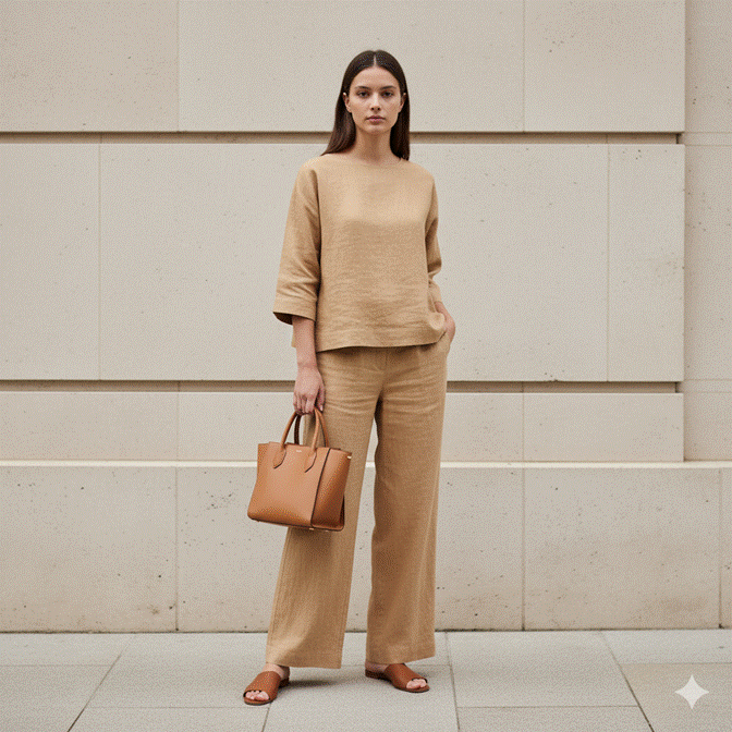 ✦ Style Tip: Choose wide-leg trousers in a fabric with enough weight to drape beautifully — satin-finish fabrics, medium-weight woven wool blends, or fluid crepe all create the clean, elongated line this look depends on. Lightweight fabrics in wide-leg cuts tend to cling and bunch, which undermines the silhouette’s entire visual logic.
