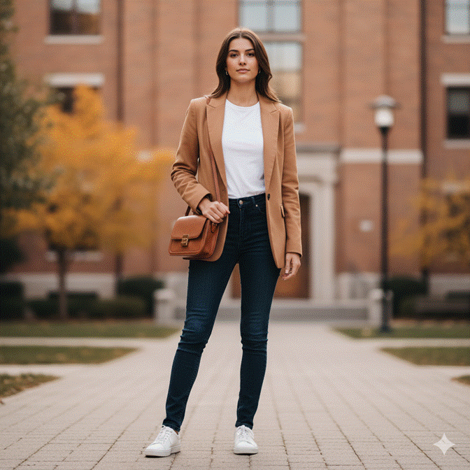 For fall back-to-school dressing, a medium-wash or dark indigo straight-leg or slim-fit jean pairs most cleanly with a blazer in camel, warm grey, navy, or a tonal plaid. Underneath, a simple white or cream fitted tee keeps the focus on the outer layers. Minimal sneakers or loafers complete the look without competing with the blazer’s quiet authority.