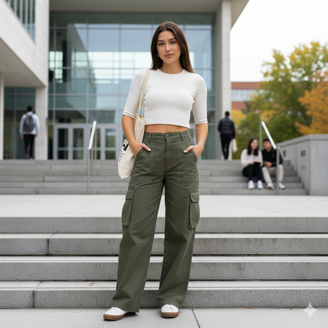 For campus wear, cargos in olive, taupe, warm grey, or washed black pair most elegantly with a fitted or semi-fitted crop top or a simple ribbed vest. The volume of the cargo pants against a close-fitting upper half creates the kind of silhouette contrast that generates genuinely stylish outfits. A clean white tank, a fitted ribbed tee, or a simple crop in a complementary tone all function beautifully as the upper counterpart.