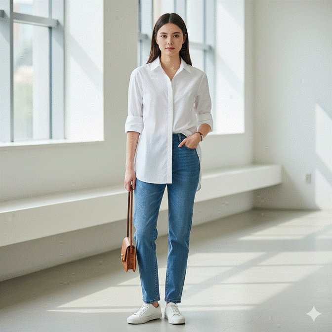 ✦ Style Tip: Invest in a white shirt with a fabric weight that prevents transparency — poplin is excellent for this purpose — and ensure the fit through the shoulders is precise even if the body is slightly oversized. A white shirt that fits correctly through the shoulders and chest but has room through the torso reads as intentionally relaxed; one that is too large through the shoulders reads simply as too large.