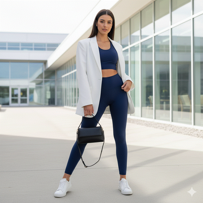 A high-quality matching athletic set in a neutral or muted palette — deep navy, forest green, warm black, or charcoal — instantly reads as more intentional than one in loud or novelty prints. Layered with an oversized blazer or a tailored shirt tied at the waist, carried in a structured tote or crossbody rather than a gym backpack, and finished with a clean white sneaker, the athletic set becomes a considered style statement rather than a last-resort outfit.