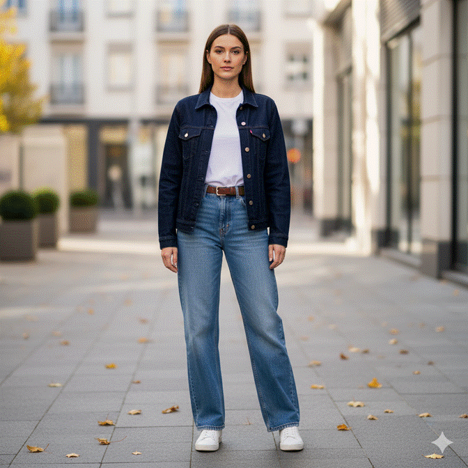 ✦ Style Tip: Introduce one non-denim element to ground the double-denim combination — a white tee visible at the neckline, a leather belt, a canvas tote, or a wool-blend blazer worn over the denim jacket. This element gives the eye a resting point within the denim-dominant palette and prevents the outfit from feeling too uniform or too casual.