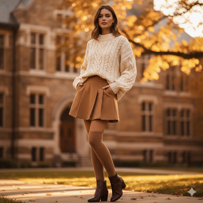 For a collegiate context, the mini works best in structured fabrics that hold their shape through a long day — a wool-blend pleated mini, a denim mini in a clean wash, or a leather-effect mini in black or chocolate brown. The chunky knit above in cream, warm camel, or rust adds the season’s warmth while the mini keeps the look proportionally dynamic and fashion-forward.
