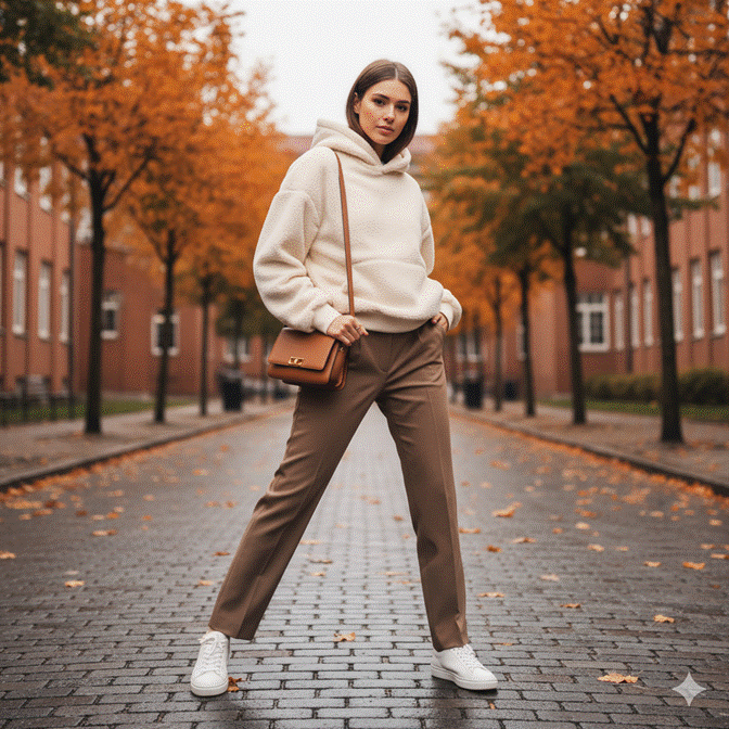 The oversized hoodie paired with straight-leg tailored trousers is one of contemporary campus style’s most compelling visual paradoxes — and it works precisely because of that paradox. The extreme contrast between the hoodie’s casual ease and the trousers’ clean structure creates an outfit that looks simultaneously effortless and entirely deliberate.