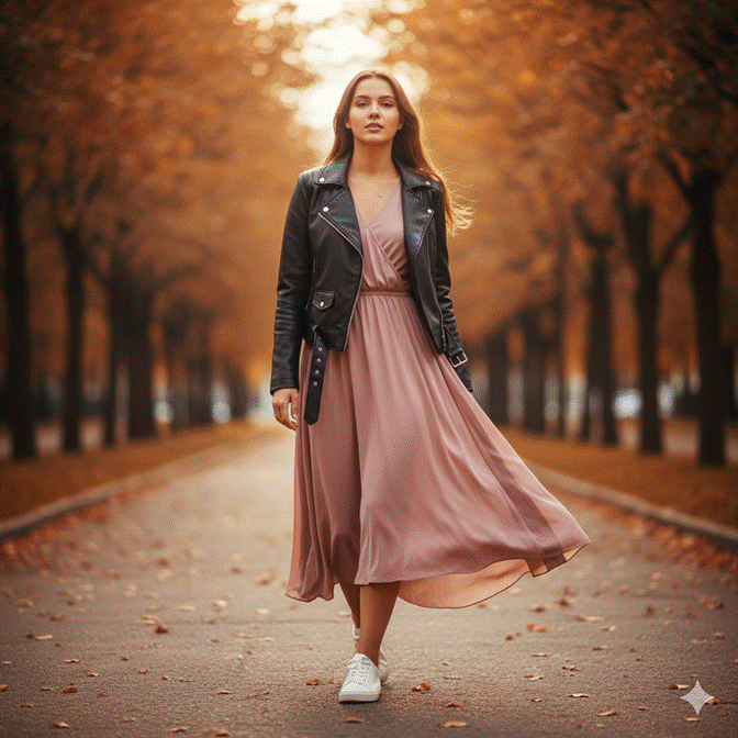 A leather jacket over a midi dress is one of those outfit combinations that works because of — not despite — its inherent tension. The soft, flowing femininity of a midi dress against the structured, slightly hard-edged quality of a leather jacket creates a visual conversation between opposite textures that consistently produces interesting, compelling results.