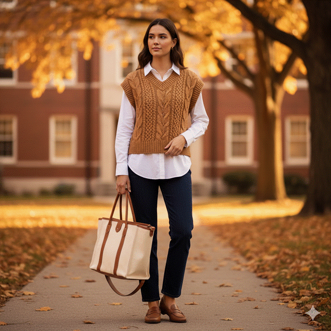 The preppy, collegiate energy of a knit vest over a collared white shirt is one of those aesthetics that has proved remarkably durable across fashion cycles precisely because it feels genuinely at home on a campus — it belongs there, in a way that borrowed runway aesthetics sometimes do not. Pair with straight-leg jeans or tailored trousers and simple loafers for the complete, cohesive look.
