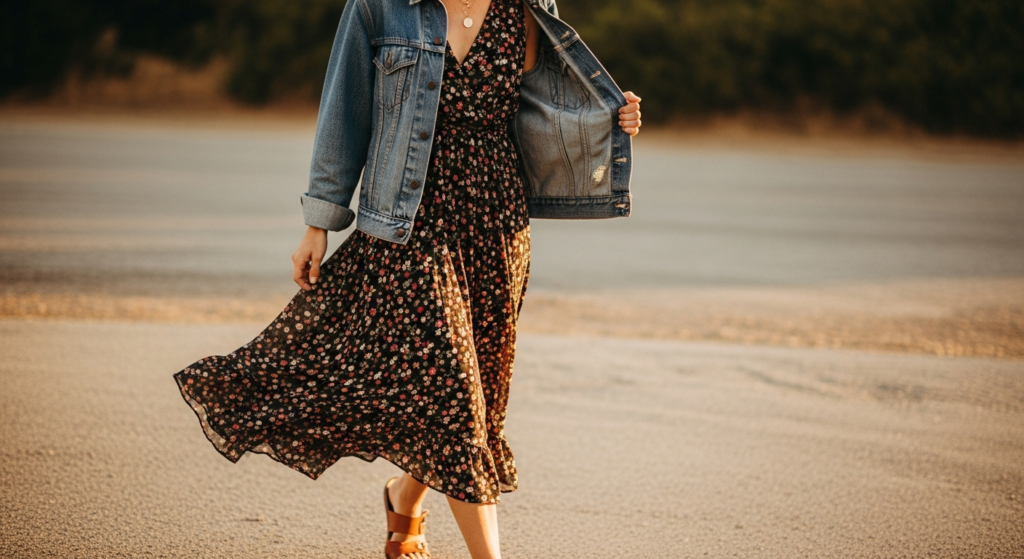 Clean dark or medium-wash denim — worn as a jacket or a half-tucked shirt — paired with a flowing floral skirt is the denim look outfit that most perfectly captures the effortless personal style of mixing the structured and the romantic into a single, naturally beautiful composition. It is the look that appears to have taken no thought while actually communicating a genuine understanding of how contrast makes an outfit interesting.