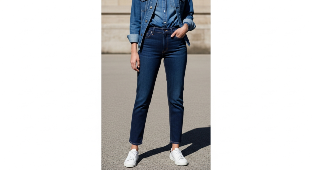 Styling Tip: The success of a monochrome dark denim look is entirely dependent on clear tonal separation between each denim piece — wearing three pieces of identical denim wash creates a flat, undifferentiated effect. A dark indigo jean with a slightly lighter indigo denim shirt and a slightly lighter still denim jacket creates beautiful tonal layering that reads as deeply considered rather than accidentally matchy. Add white leather trainers for the most editorial contrast detail, a simple canvas or leather bag in a complementary neutral, and minimal metallic jewellery. The all-blue denim look is the most photographically powerful in bright, clean natural daylight.