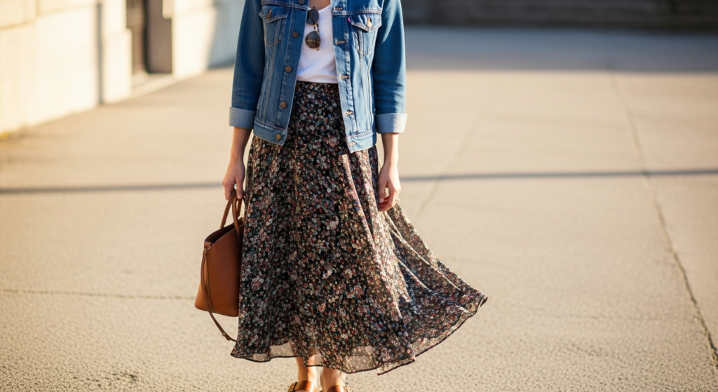 Styling Tip: Choose a floral skirt in a lightweight fabric — cotton lawn, fine rayon, or quality chiffon — with a print that includes at least one tone that the denim piece can complement. A floral with deep navy or indigo in the print worn beneath a denim jacket creates a beautifully cohesive rather than conflicting colour story. Wear the denim jacket open, sleeves rolled, with the floral skirt and a simple fitted white or cream tee tucked at the front. Add leather sandals or clean white trainers, a simple woven or leather bag, and minimal gold jewellery.