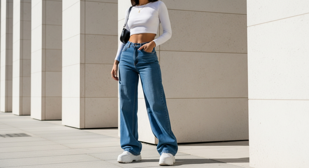 Styling Tip: Choose wide-leg or barrel-leg denim in a quality medium wash — neither too light nor too dark — in a silhouette that sits at the natural waist rather than the hip for the most flattering proportional result. Pair with a fitted ribbed crop top, a quality baby tee, or a simple fitted sports crop in a complementary neutral — white, cream, warm grey, or caramel. Add chunky platform trainers or clean white leather trainers, a small crossbody or quality canvas bag, and simple gold jewellery. The proportional contrast of this denim look is the most powerful in bright, clean outdoor natural light.