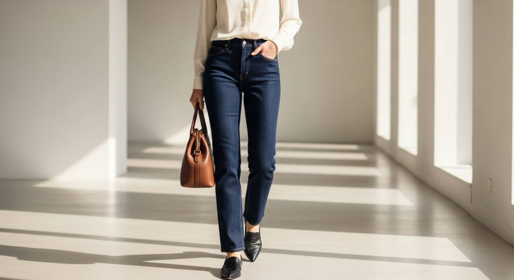 Styling Tip: The work-adjacent denim look succeeds or fails on the condition of the denim — dark, clean, well-fitted, and in immaculate condition communicates professionalism; faded, distressed, or poorly fitted denim communicates the opposite. Choose dark indigo or black straight-leg or tailored-cut jeans and pair with a quality silk blouse or fine merino knit in a professional tone. Add quality leather loafers or clean pointed-toe shoes, a structured leather bag, and simple, restrained jewellery. Every piece must be in excellent, impeccably maintained condition — the work-adjacent denim look is only as professional as its least carefully maintained element.