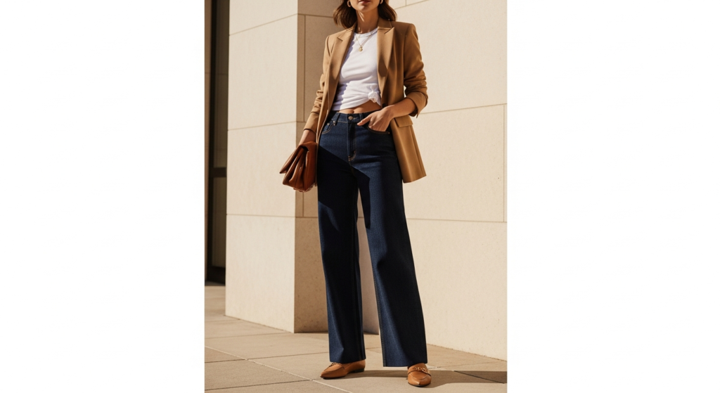 Styling Tip: Choose wide-leg denim in a clean, dark indigo or deep black wash — the cleaner and darker the denim, the more professional and the more broadly occasion-appropriate the overall look becomes. Pair with a blazer in a complementary neutral — camel, cream, warm grey, or classic black — fitted at the shoulder and slightly relaxed through the body. Tuck a simple white or quality cream tee at the front only for the most modern, most effortless finishing touch. Add pointed-toe leather loafers or clean leather ankle boots, a quality structured leather bag, and simple gold jewellery.