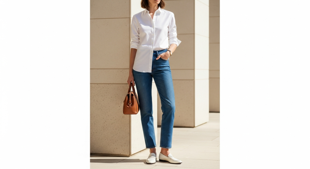 Styling Tip: The quality of each individual piece is everything in this outfit. A quality white shirt — clean, well-fitted at the shoulder, and made from a quality cotton that holds its shape — paired with dark indigo straight-leg or slim-cut jeans in excellent, unbleached condition. Half-tuck the shirt at the front for the most modern interpretation. Add clean leather loafers or pointed-toe leather shoes, a quality leather watch, and a simple leather bag. Every element should be in immaculate, well-maintained condition — this denim look outfit works precisely because of its simplicity, and simplicity is completely unforgiving of poorly maintained pieces.