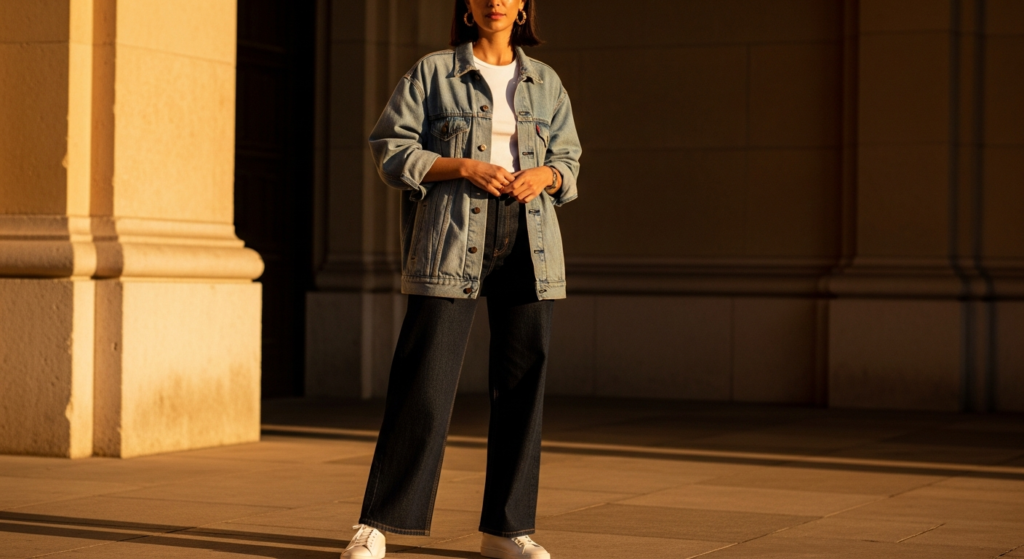 The wide-leg denim trouser worn with a precisely fitted or slightly oversized blazer is the denim look outfit that most completely bridges casual and polished — a combination that reads as genuinely professional in creative environments and effortlessly stylish in every other context. In 2025, wide-leg denim and a quality blazer is the smart-casual denim outfit that everything else is judged against.