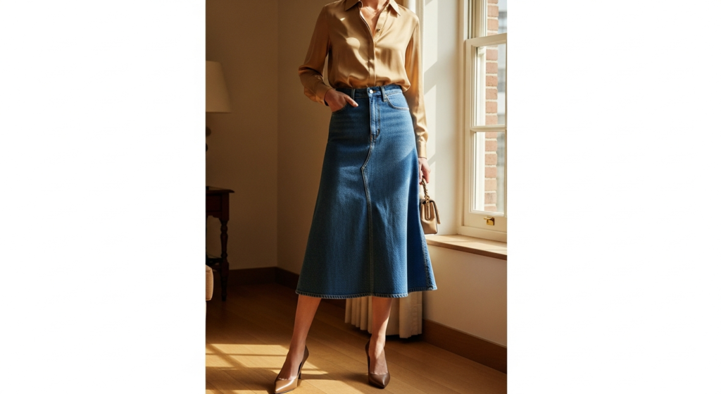 Styling Tip: Choose a denim midi skirt in a clean, medium to dark wash with a silhouette that creates a clean, uninterrupted line from waist to mid-calf — no distressing, no heavy stitching, no embellishment. Pair with a quality silk blouse in a rich, considered colour — warm champagne, dusty rose, cobalt blue, or rich emerald — tucked fully at the front and out at the back for the most modern, most effortless finish. Add pointed-toe leather heels or leather mules, a small structured bag, and delicate gold jewellery. This denim look outfit photographs most beautifully in warm, golden natural light where the satin sheen of the silk catches the light most beautifully against the matte texture of the denim.