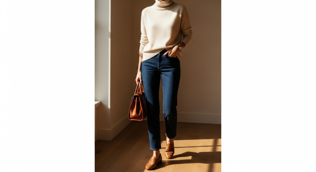 Styling Tip: Choose a quality cashmere or merino turtleneck or crew neck in warm ivory, warm grey, or soft camel and pair with precisely fitted straight-leg dark denim in impeccable condition. Tuck the knit loosely at the front for a slight waist definition without stiffness. Add quality leather loafers — a genuine investment in good leather rather than a fashion-only purchase — a quality top-handle leather bag in tan or cognac, and a simple gold watch. This is the denim look outfit for days when comfort and elegance must coexist completely without compromise.