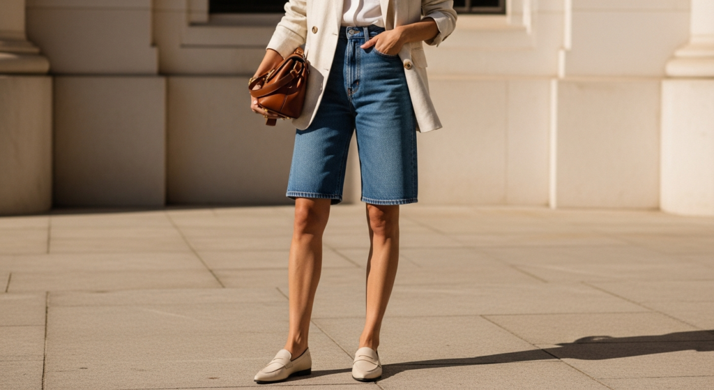 Styling Tip: Choose denim shorts in a clean medium or dark wash — no distressing, no excessive fraying, no embellishment — in a tailored cut that sits cleanly at the high waist and falls to a flattering mid-thigh length. Pair with a structured blazer in camel, cream, warm grey, or classic navy. Add a simple fitted tee or quality silk camisole underneath, pointed-toe leather loafers or block-heel sandals, and a quality structured leather bag. The contrast between the casualness of the denim shorts and the authority of the blazer is what creates this denim look outfit’s genuinely surprising and genuinely elegant visual impact.