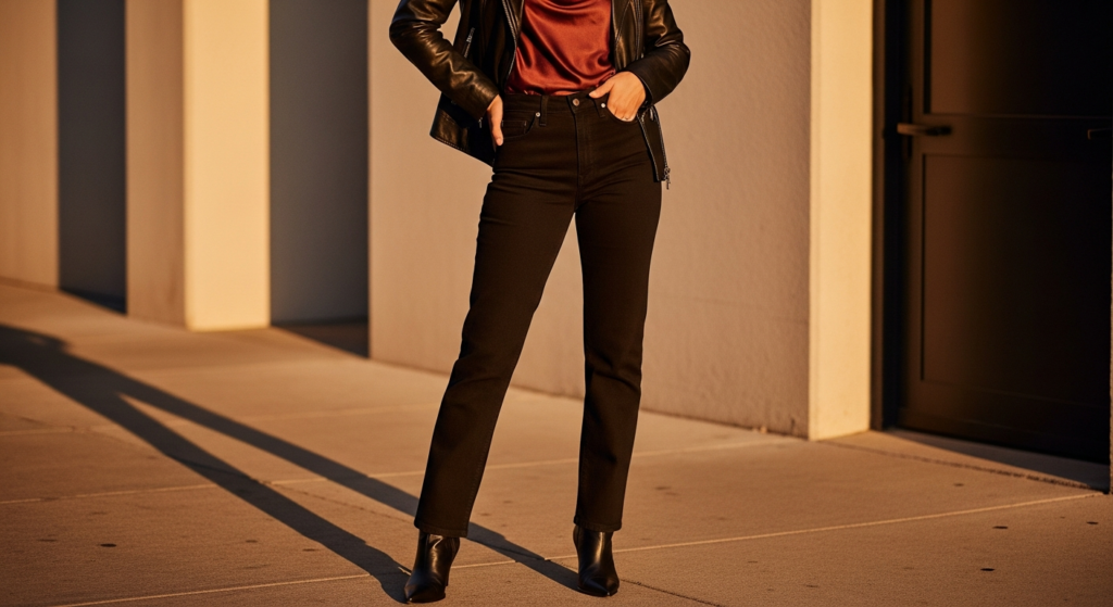Styling Tip: Choose dark denim in the cleanest possible wash — no fading, no distressing, no visible wear — in a straight-leg or slightly tapered cut that reads as deliberately chosen rather than simply default. Wear a quality satin or silk camisole or blouse in a rich colour — deep champagne, warm burgundy, or rich emerald — beneath a fitted or slightly relaxed black leather jacket. Add pointed-toe heeled ankle boots or strappy flat sandals, a small leather clutch or structured bag, and simple gold jewellery. The combination of dark denim, quality leather, and satin or silk communicates a genuine, effortless evening confidence.