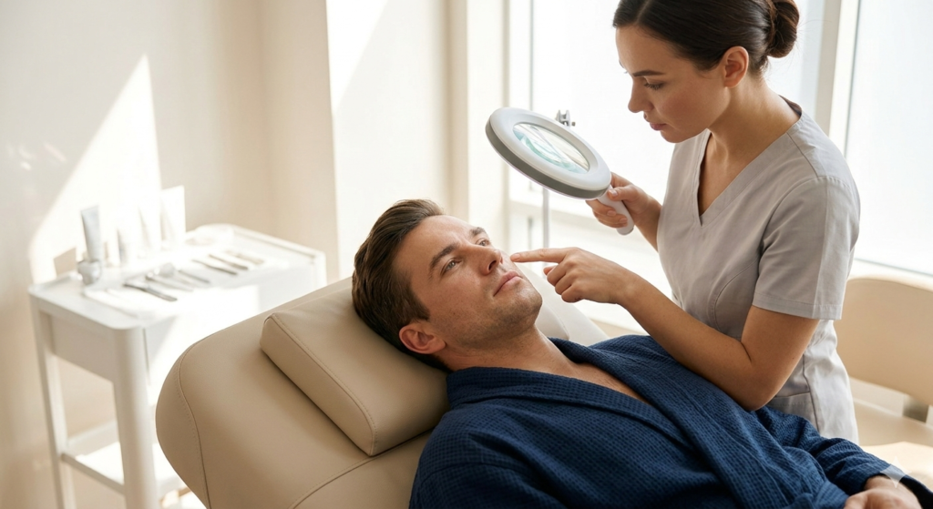 The esthetician evaluates your skin type, concerns, and grooming habits. They may ask about shaving frequency, breakouts, oiliness, dryness, or sensitivity.
