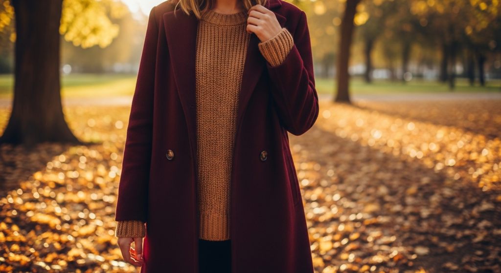 Caption Inspiration: — “Dressing like the trees are showing off.” — “Autumn has the best wardrobe. I am simply inspired.” — “Every season has a colour story. This one is mine.” — “Burgundy, camel, and the particular light of October.” — “Wearing the season before putting it on.”
