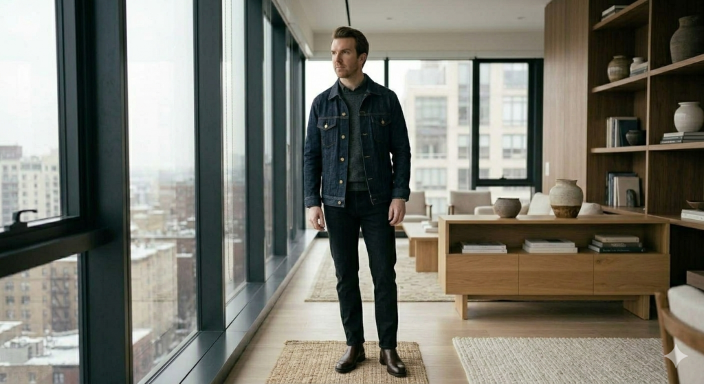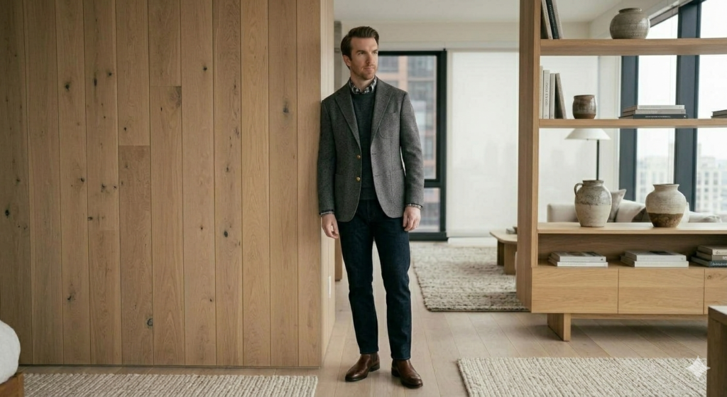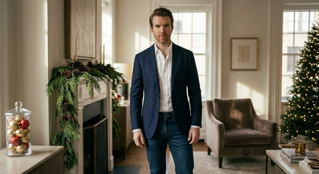 A tailored blazer paired with dark denim offers a polished yet relaxed holiday look. It’s perfect for casual dinners and festive gatherings where you want to look sharp without appearing overly formal.