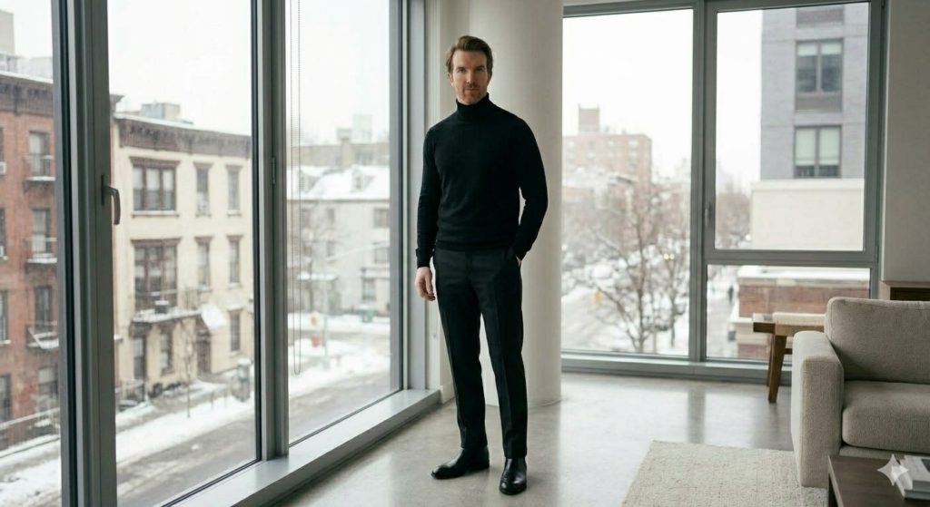 A turtleneck creates a clean and elegant silhouette that feels modern and sophisticated.