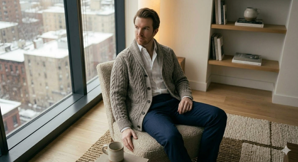 A cardigan layered over a dress shirt strikes the perfect balance between relaxed and refined.