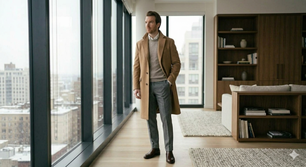 9. Wool Overcoat with Neutral Layers