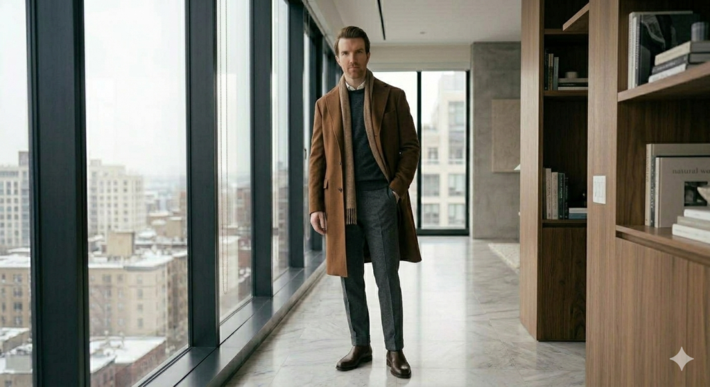A wool coat combined with a textured scarf is both practical and stylish during winter celebrations.