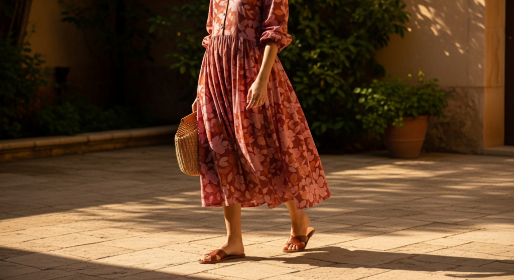 Styling Tip: Choose a garden party mode inspo outfit in a fabric that moves beautifully in outdoor conditions and responds warmly to natural light. A flowing floral midi dress in a quality cotton lawn or light chiffon, a linen wide-leg trouser and silk blouse combination, or a beautifully cut sundress in a rich, warm seasonal colour all create genuinely beautiful garden party mode inspo looks. Add flat leather sandals or low block-heel mules for a combination of elegance and practicality on outdoor surfaces, a quality straw or woven bag, and delicate gold jewellery that catches the natural light beautifully. Wear with sun-touched natural makeup and simply dressed hair for the most authentic and the most genuinely beautiful garden party aesthetic.