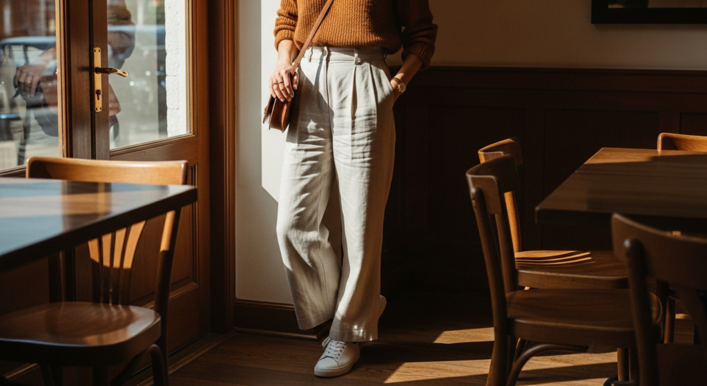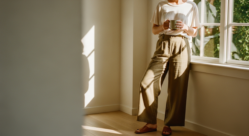 Styling Tip: The Sunday slow morning mode inspo look has nothing to prove and everything to feel. A quality linen wide-leg trouser in warm sand or soft sage, a quality oversized white or cream tee or a beautifully soft long-sleeve knit, bare feet or simple leather slides, hair in its most natural state, and the kind of minimal jewellery — a simple ring, a fine chain — worn so often it is less a styling decision than simply a part of daily existence. The Sunday slow morning mode inspo aesthetic is the most difficult to photograph convincingly because its beauty is almost entirely internal — the quality of fabric against skin, the warmth of morning light through a window, the feeling of being entirely, completely yourself in what you are wearing.