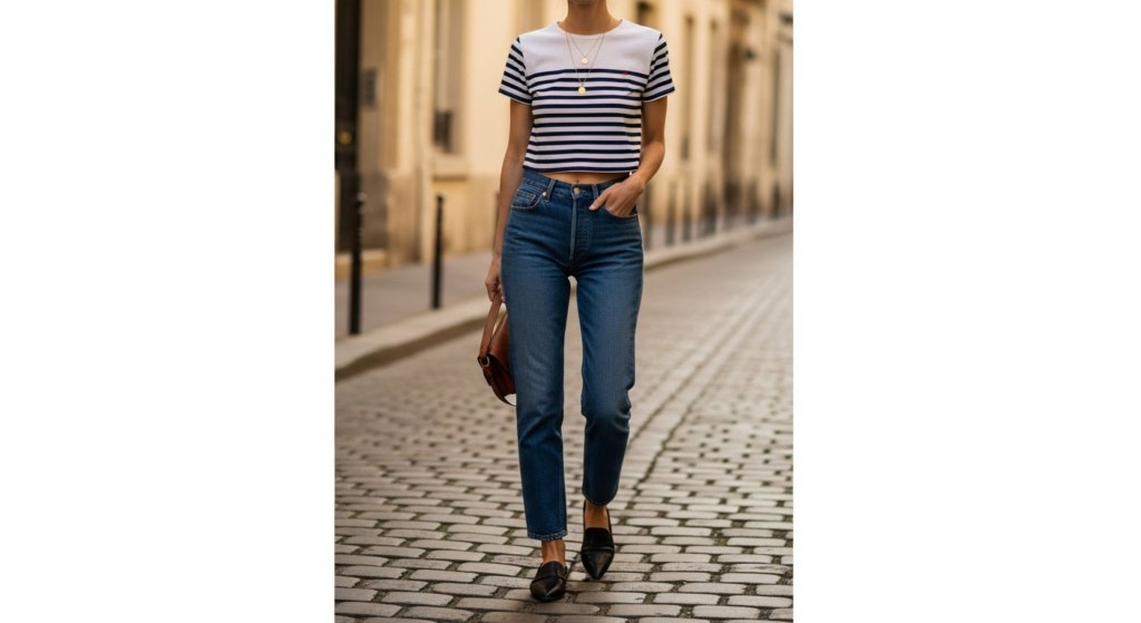 Styling Tip: The Parisian mode inspo look is built on three fundamental principles — quality basics, considered proportion, and deliberate imperfection. A quality white or stripe marinière tee, precisely fitted straight-leg dark indigo jeans, a barely-there gold necklace, and pointed-toe leather loafers or simple leather ballet flats. The shirt is half-tucked rather than fully tucked. The jeans are rolled once at the ankle to reveal the shoe. The necklace sits quietly at the collarbone rather than demanding attention. A simple leather bag in a classic tone — black, camel, or cognac — completes the look. Nothing matches precisely. Everything harmonises perfectly.