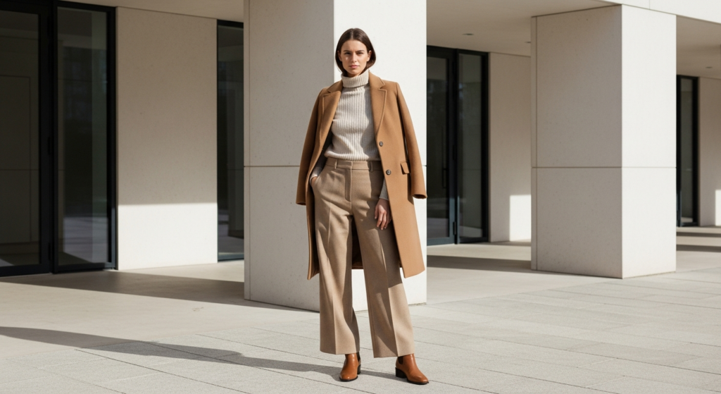 Styling Tip: Build the Scandinavian minimal mode inspo look from a foundation of three to four pieces in the same tonal family. A fine ribbed turtleneck in warm cream, wide-leg trousers in warm oatmeal, a structured coat in warm camel or soft greige, and clean leather ankle boots in the same warm neutral family. Zero additional accessories except one simple gold ring and a quality leather or canvas bag. Every piece must fit with precision — the Scandinavian minimal aesthetic is completely unforgiving of poor fit, since the beauty of the look comes entirely from the clean line and the quality of the fabric rather than from decorative elements that can compensate for fit issues.
