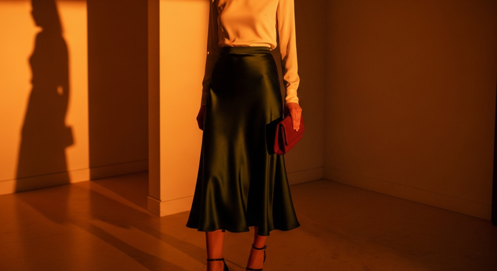 Styling Tip: Choose an evening mode inspo outfit built around a single hero piece — a beautifully cut satin midi skirt, a sculptural evening top in a rich jewel tone, or a flowing bias-cut dress in champagne or deep emerald. Build everything else around this hero piece with maximum restraint — simple shoes, minimal jewellery, a clean leather or fabric evening clutch. The hero piece should be of the highest quality you can access — the difference between an extraordinary evening outfit and a simply acceptable one is almost always the quality and the drape of the central fabric. Add one piece of genuinely beautiful jewellery — a single statement ring, fine earrings, or a delicate necklace — and leave everything else deliberately absent.
