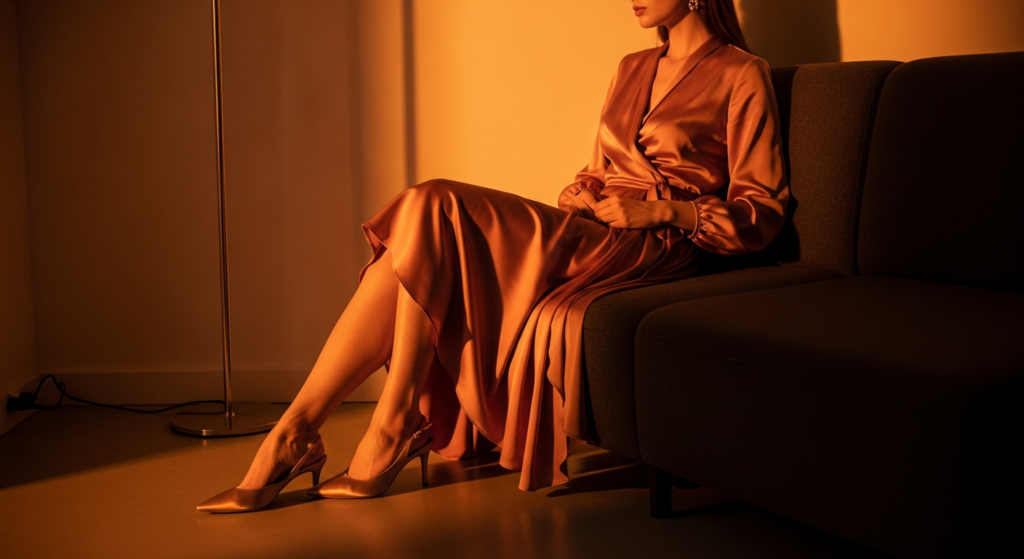 Styling Tip: Choose a date night mode inspo outfit in a fabric that responds most beautifully to warm, low, intimate lighting — satin, silk, velvet, and fine jersey all catch and reflect warm light with extraordinary beauty. A deep jewel-toned satin slip dress, a velvet midi skirt with a simple fitted top, or a silk wrap dress in a warm, flattering tone all create the most genuinely beautiful date night mode inspo looks. Add pointed-toe heels or strappy sandals, a small structured bag, and jewellery chosen for its beauty under intimate lighting — gold that catches candlelight, a ring that catches the light when you gesture, earrings that move when you laugh.