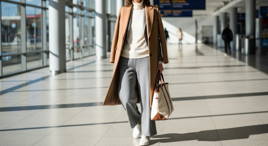 Styling Tip: The most beautiful travel day mode inspo outfit is built entirely on the comfort-without-compromise principle. A premium wide-leg tracksuit or matching jogger set in a quality brushed cotton — in warm grey, deep navy, or warm cream — elevated with a quality cashmere or merino turtleneck as a mid-layer and a structured coat or longline jacket as the outermost piece. Add clean leather trainers or slip-on leather loafers, a quality tote large enough for carry-on essentials, and minimal gold jewellery that will pass security without being removed. The quality of the base layers — the tracksuit’s fabric, the turtleneck’s knit — is what transforms a travel outfit from comfortable to genuinely inspiring mode inspo.