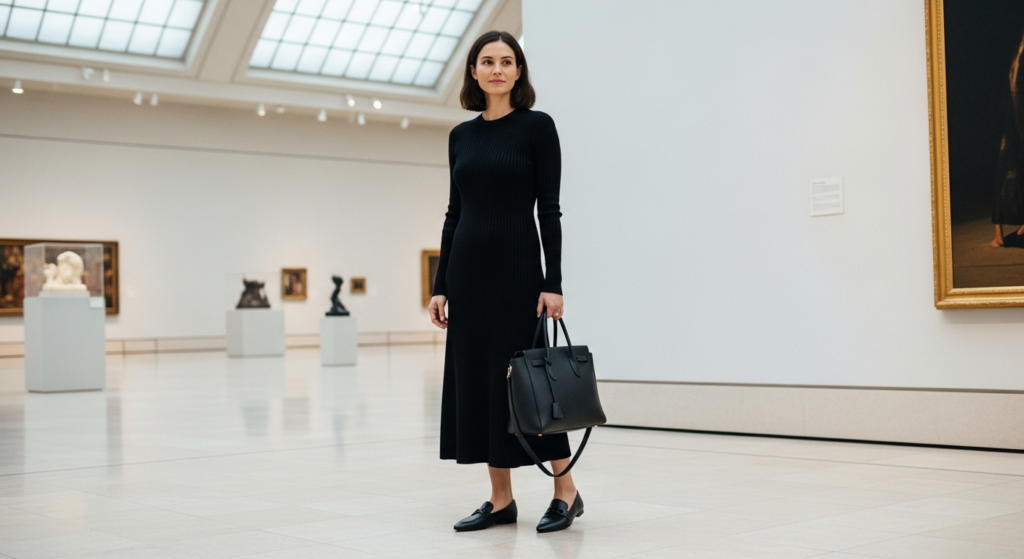 - A quality all-black or deep neutral NYC outfit is one of the most broadly appropriate and the most visually intelligent museum day choices: all-black allows the art to read without visual competition from the viewer’s clothing, and communicates a specific quality of aesthetic seriousness and personal confidence.