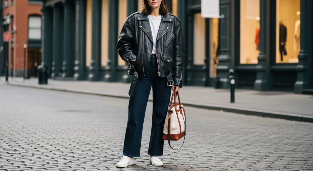 - Build the SoHo Saturday NYC outfit around one piece of genuine visual character: an oversized leather jacket in a deep, rich tone; a sculptural wide-leg trouser in an unusual fabric; a beautifully vintage-found blazer of real character; or a bold printed piece that communicates a clear aesthetic point of view.