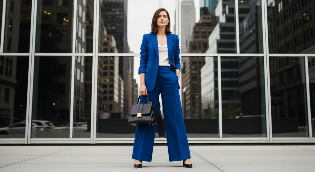 - Add one piece of personal character within the professional framework: a silk blouse in a rich jewel tone visible at the blazer’s neckline; a distinctive leather bag of genuine quality; or a single piece of considered jewelry that communicates personal taste within the professional context.