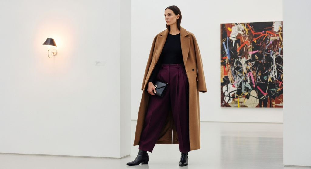 - Choose one extraordinary piece as the NYC outfit’s visual anchor for a Chelsea gallery opening: a sculptural wide-leg trouser in a deep or unusual fabric; a dramatically oversized coat of genuine character; a sheer or embellished blouse of real craftsmanship; or a piece of genuinely exceptional vintage clothing that carries its own visual authority.