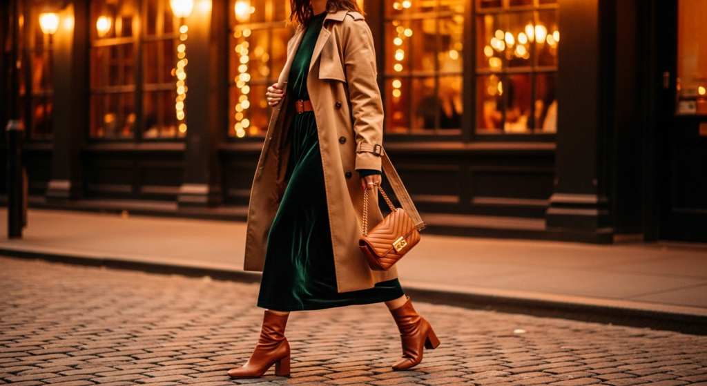 - Add a quality coat as the outer layer: a camel trench, a structured wool coat in deep navy, or a dramatically oversized coat in a jewel tone all function beautifully as the West Village evening NYC outfit’s outermost layer — providing both the warmth of a New York autumn evening and the additional visual authority of a genuinely beautiful coat.