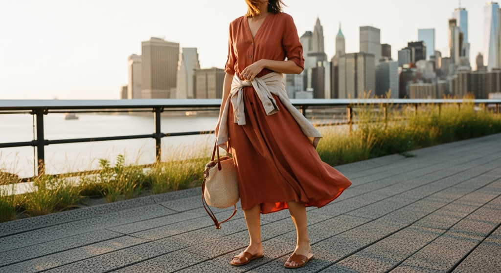 - Choose a relaxed but considered outer layer: a thin linen or cotton jacket, a quality denim thrown loosely over the shoulders, or a beautifully draped scarf in a complementary warm tone — layering for the specific evening chill that arrives after the sun drops below the Hudson.