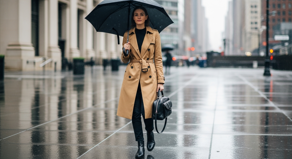 - Invest in a quality trench coat or rain jacket of genuine aesthetic authority: a classic belted trench in camel, stone, or deep navy is the most broadly appropriate and the most enduringly beautiful rainy day NYC outfit outerwear choice — functional, beautiful, and unmistakably New York in its particular combination of practical elegance.